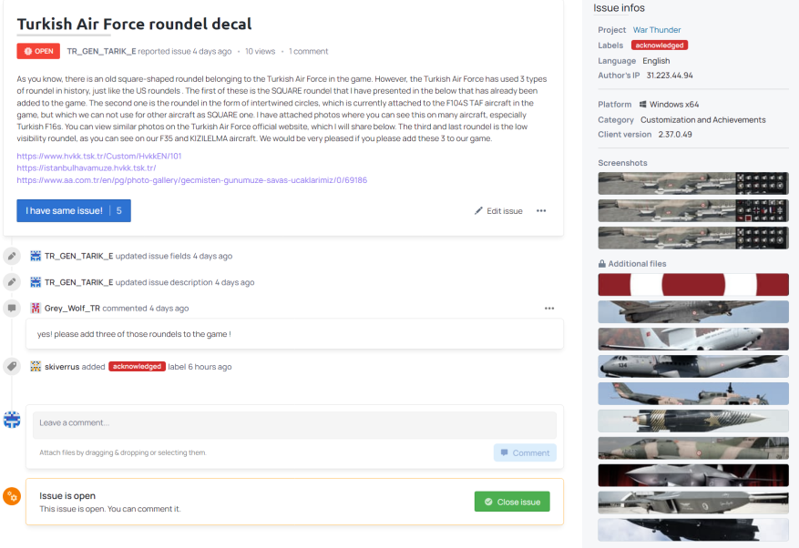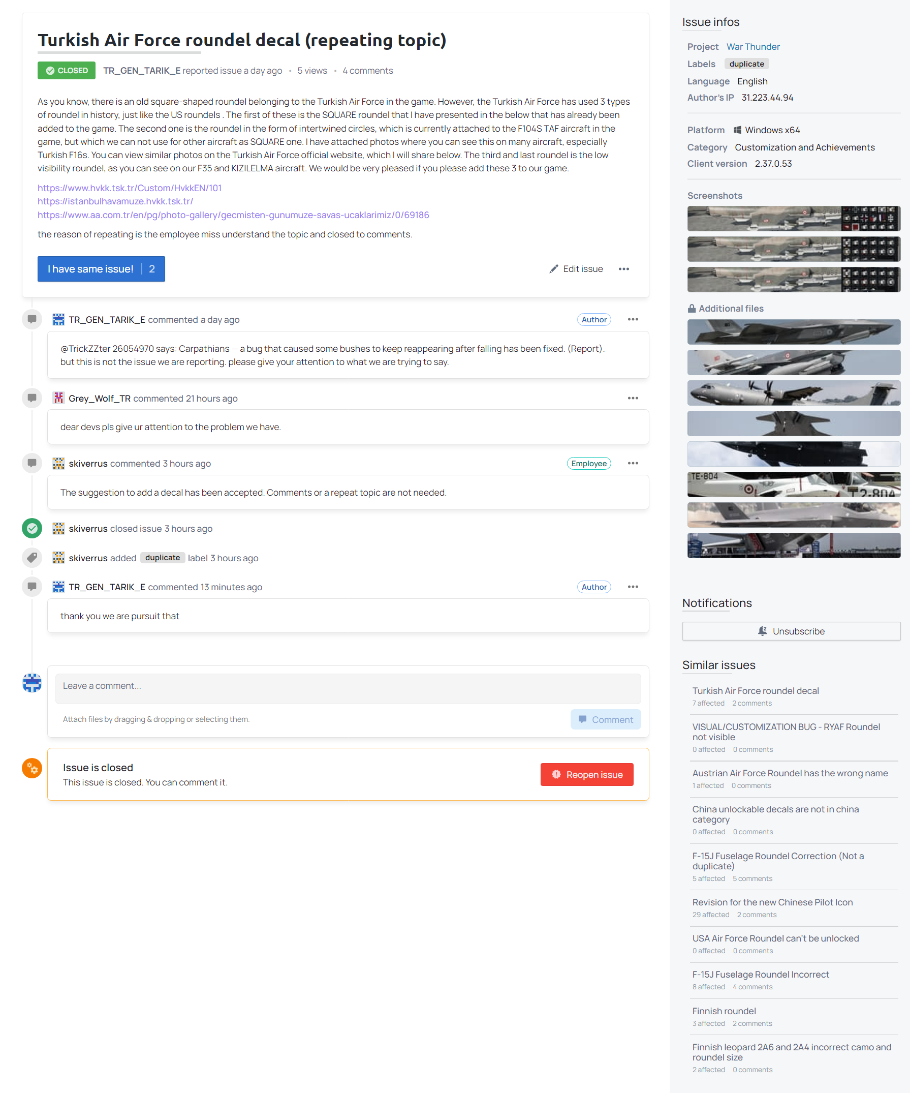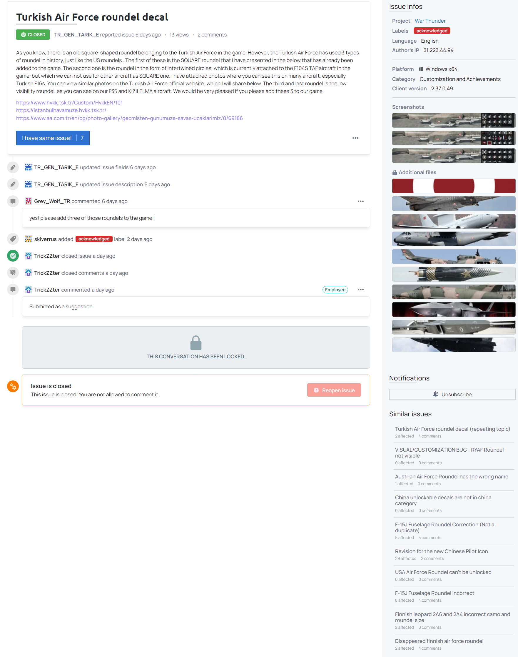 TR_GEN_TARIK_E Bildiğiniz gibi, oyunda Türk Hava Kuvvetlerine ait eski kare şeklinde bir armamız var. Ancak, Türk Hava Kuvvetleri tarih boyunca, tıpkı Amerikan armaları gibi 3 tür arma kullanmıştır. Bunlardan ilki, aşağıda sunduğum ve oyuna zaten eklenmiş olan KARE armadır. İkincisi, oyundaki F104S TAF uçağına eklenmiş olan ancak KARE olan gibi diğer uçaklar için kullanamadığımız iç içe geçmiş daireler şeklindeki armalı armadır. Bu armayı, özellikle Türk F16′ları başta olmak üzere birçok uçakta görebileceğiniz fotoğrafları ekledim. Aşağıda paylaşacağım Türk Hava Kuvvetleri resmi web sitesinde benzer fotoğrafları görüntüleyebilirsiniz. Üçüncü ve son arma ise F35 ve KIZILELMA uçaklarımızda görebileceğiniz düşük görünürlüklü armadır. Bu 3 armayı da oyuna eklemenizi rica ederiz. 3= Düşük Görünürlük (AKINCI Standart Roundel ile KIZILELMA ise Düşük Görünürlük Olan ile) 2= Standart 1= Eski Standart Yaptığımız çalışmalar sonucunda ek de de görebileceğiniz üzere oyunda var olan 1. armamıza ek olarak 2. ve 3. armaların oyuna ekleneceği haberini vermekten mutluluk duyuyorum. Burda şunu da belirtmek isterim ilk başta gelişi güzel cevap vererek tepkimizi ölçmek istediler: Kendisini rapor edip üzerine aynı konuyu tekrar açtık bu şekilde gelişi güzel cevap vereni. Ve ardından En alttaki ek raporda da etiketledik kendisini. Şimdi kontrol ettiğimde verdiği cepabı değiştirmiş kendisi. Değiştirdiği cevabı da görebilirsiniz. Lakin burda şu şüpheyi verdi eklenmeyebilir mi diye lakin 2. konuda bize cevap veren kişi sağolsun ekleneceğini onayladı. Emin olmak için ikinci kez açtık ve oyuna ekleneceği hususundaki kesin bilgiye ulaşmış bulunmaktayız. Bu daha ilk adım inşallah yakında Türk TT sini de birlikte oyuna ekleteceğiz. “ BU BAŞARIYI TÜM TÜRK KOMİNİTESİNE ADIYOR VE BİRLİKTE DAHA NİCE ÜLKEMİZİ BAYRAĞIMIZI TEMSİL EDECEK BAŞARILARI BİRLİKTE KAZANMAYI ALLAHTAN NİYAZ EDİYORUM. ” =TurAF= TR_GEN_TARIK_E
